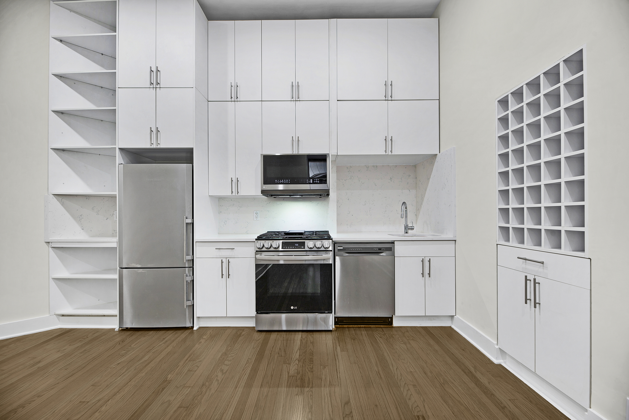 Features open gourmet kitchen with Quartz countertops, double high cabinetry, built-in wine rack, and high-end stainless steel appliances including a dishwasher.