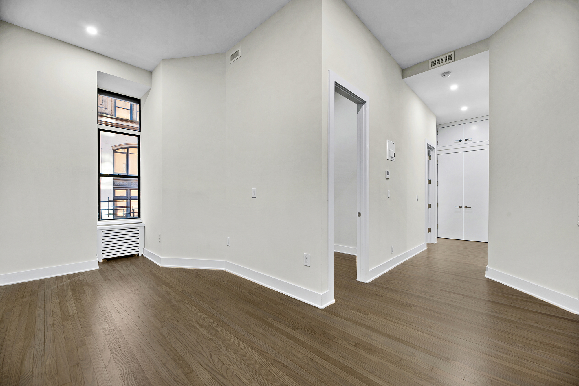 Southern exposure. Beautiful hardwood floors, extra high ceilings, and LED recessed lighting throughout the apartment.