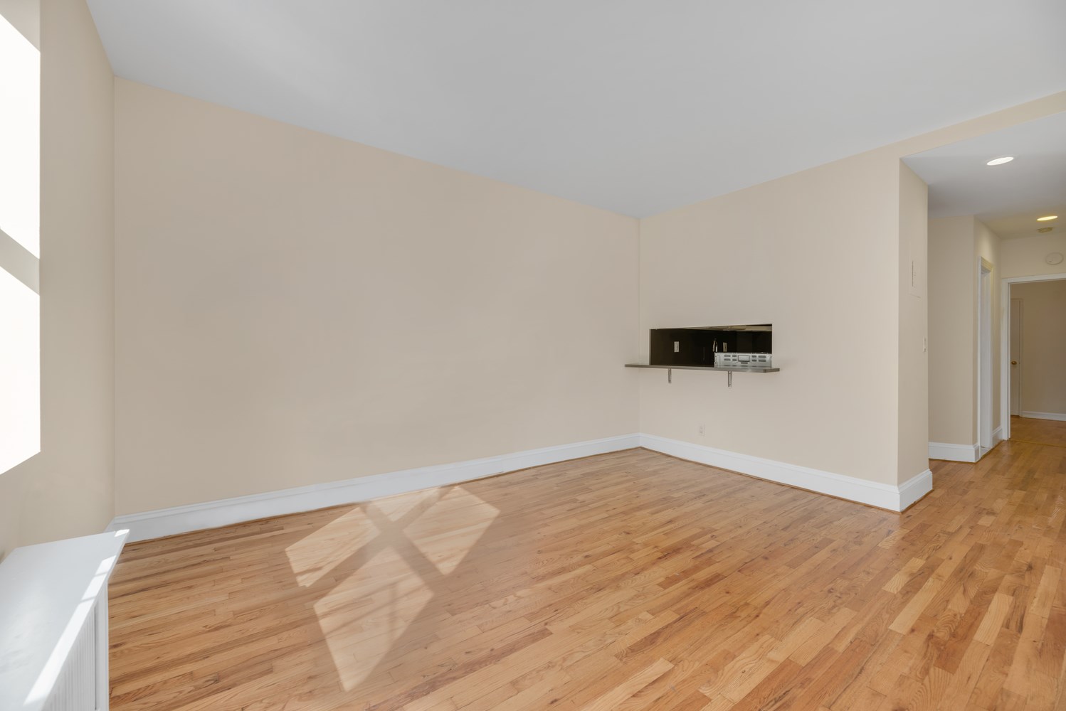 Spacious living room. High ceilings and hardwood floors throughout. Heat and hot water included.